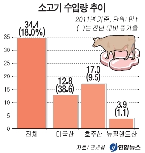 12일 관세청이 내놓은 '2011년 농축수산물 수입가격 동향'에 따르면 작년 우리나라에 들어온 소고기량은 34만4천t으로 2010년(29만t)보다 18% 늘었다.