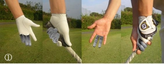사진 ①과 ②는 손에 힘을 빼기위한 방법을 설명한 것이다. 사진에서 보듯이 분명히 그립은 어두운 색으로 칠해진 손가락만을 사용하여 잡아야 한다. 그렇지 않으면 사용해야할 손가락만을 사용하기 어려워 손 전체에 힘이 들어가기 마련이다. 손 전체를 이용하여 그립을 쥐는 것은 누구나 할 수 있는 방법이다.