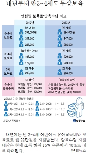 내년에는 만 3~4세 어린이도 유아교육비와 보육료로 월 22만원을 지원받는다. 양육수당 지원 대상은 현재 소득 하위 15% 수준에서 70%로 대폭 확대된다. /연합뉴스