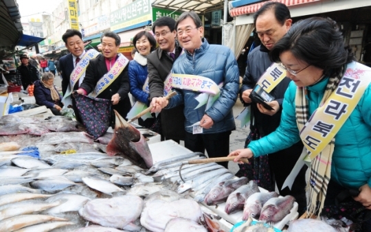 18일 전주 남부시장에서 김용화 전북도의장(오른쪽 세번째) 및 도의원들이 설 명절 맞이 전통시장 장보기 와 온누리 상품권 사용 홍보 캠페인을 하고 있다.