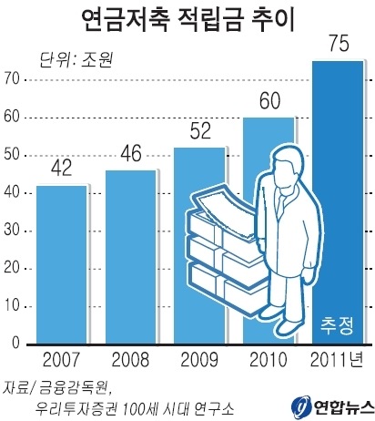 이 수치는 보험사의 연금저축보험과 은행의 연금신탁, 자산운용사의 연금저축펀드 등을 합한 것으로 2007년 42조원, 2008년 46조원, 2009년 52조, 2010년 60조으로 늘어 그동안 10% 안팎의 증가율을 보여왔다.