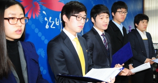 �� 19일 전주시청 브리핑룸에서 전북대 총학생회 임원들이 전주탄소산단 조성과 관련하여 효성유치를 촉구하는 기자회견을 갖고 있다. 추성수기자chss78@