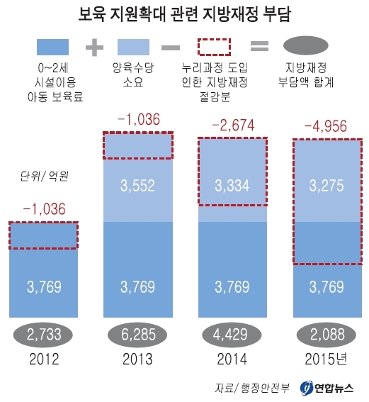 24일 행안부에 따르면 오는 3월부터 시설을 이용하는 0∼2세 유아에 대한 보육료 지급이 소득에 관계없이 모든 계층으로 확대되면서 늘어나는 예산 중 50.6%인 3769억원을 지자체가 부담한다.
