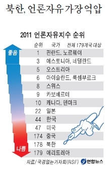 국제 언론단체 '국경없는 기자회(RSF)'가 25일 발표한 '2011년 언론자유 지수'에 따르면 북한과 에리트레아, 투르크메니스탄이 또 언론 자유를 가장 억압하는 지역으로 꼽혔다. /연합뉴스