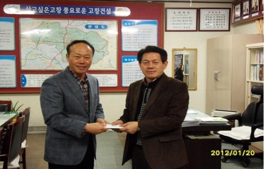 서울시니어스타워(주) 이종균 대표이사는 새해를 맞아 외롭고 소외된 사회빈곤계층을 위해 써달라며 이웃돕기성금 300만원을 고창읍에 기탁했다. 이종균 대표를 대신하여 서울시니어스타워 최한규 본부장이 전달했다.(사진)