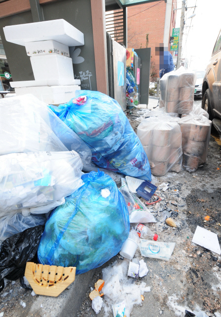 26일 전주 교동 학인당에서 남부시장으로 향하는 향교길에 설치된 분리수거대에 감시카메라가 설치되어 있음에도 명절 쓰레기 등이 지저분하게 버려져 있어 도심 미관을 해치고 있다.