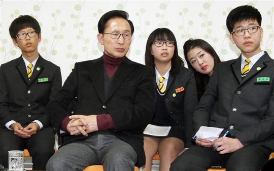 ▲ 이명박 대통령이 30일 오후 경기도 안양시 안양과천 위센타에서 열린 학교폭력 예방을 위한 학생들과의 대화에서 피해학생 학부모의 사례를 듣고 있다. 연합뉴스
