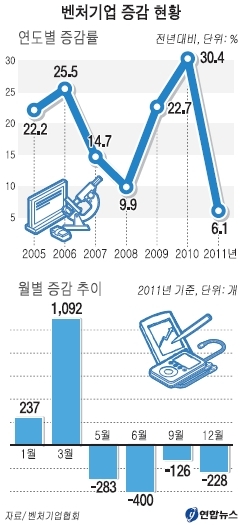 작년 5월이후 벤처기업의 수가 850개 가까이 줄었다. 정보기술(IT) 버블 사태가벌어졌던 2002∼2003년 이후 처음 있는 일이다.