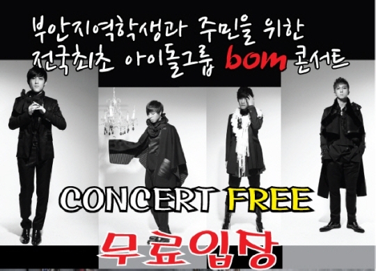 '우리의 음악을 꽃 피운다'라는 뜻을 가진 BOM(Blooming of Our Music)은 아역 배우 출신 맹세창을 비롯한 지수, 타군, 유아로 구성돼 있다. 이날 부안지역 학생과 주민이라면 누구나 무료입장이 가능하다.