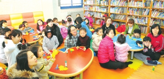 평생교육 프로그램의 하나인 '책이랑 아이랑'수업이 아직 시작되지 않았는데도 불구, 이미 10여 가족 30여 명이 10여 평에 불과한 열람실을 가득 채웠다. 4개에 불과한 원탁 책상은 이미 먼저 온 아이들과 부모들의 차지가 됐다. 대부분은 부모들의 욕심 때문에 찾아왔지만 조기교육 또는 평생교육의 열기를 내품기에 충분했다.