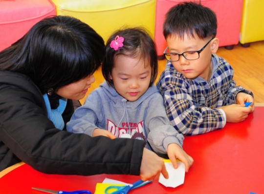 ▲  지난 28일 전북교육문화회관 평생교육'책이랑 아이랑'프로그램에 참여한 아이들이 부모들과 함께 동화구연과 색종이로 만들기 수업을 하고 있다. 안봉주기자 bjahn@