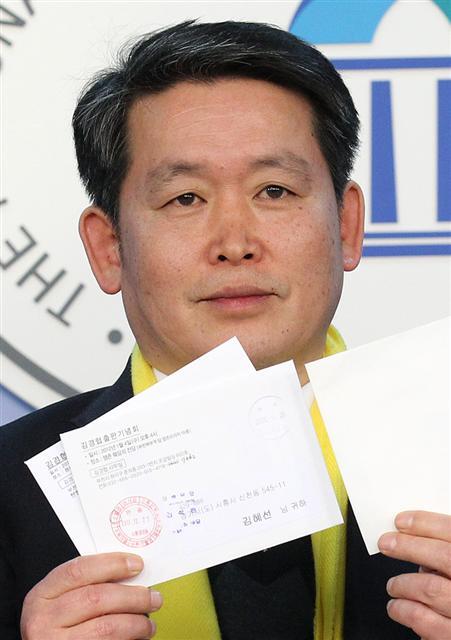 민주통합당 예비경선 금품살포 의혹을 받아온 민주통합당 부천 원미갑 예비후보 김경협씨가 2일 오전 국회 정론관에서 기자회견을 하고 있다. 검찰은 이날 돈 봉투를 뿌린 의혹을 받아온 김씨에 대한 내사를 종결한다고 밝혔다. 연합뉴스