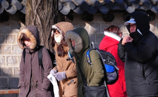 또 다시 한파가 찾아온 7일 오후 전주 경기전 길을 걷는 시민들이 얼굴을 동여맨 채 걸어가고 있다. 기상청은 오늘도 아침기온이 영하 9도까지 내려가는 맹추위가 계속될 것으로 전망했다.