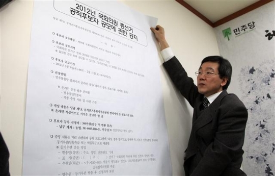민주통합당 당직자가 7일 오전 서울 영등포 당사에 2012년 국회의원 총선거 공직후보자 공모에 관한 공지문을 게시하고 있다. 4·11 총선 지역구 후보자 공천을 위한 심사작업에 본격 착수한 민주통합당 공천심사위원회는 오는 9∼11일 후보자 공모를 거쳐 13일부터 공천심사를 시작한다. 연합뉴스