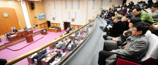 7일 전주시의회 본회의에서 대형할인점과 기업형 슈퍼마켓(SSM)이 매주 2차례 의무 휴업하도록 하는 조례를 의결하자 전통시장 상인 및 대형마트 입주자 대표들이 진지하게 회의를 방청하고 있다.