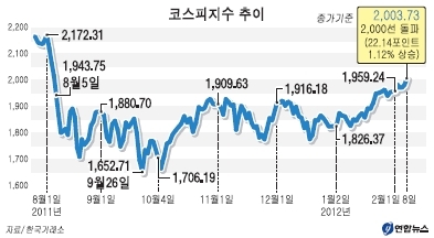 8일 코스피는 전날보다 22.14포인트(1.12%) 오른 2,003.73에 장을 마감했다. 코스피가 2,000선을 회복한 것은 작년 8월4일 이후 6개월만이다.