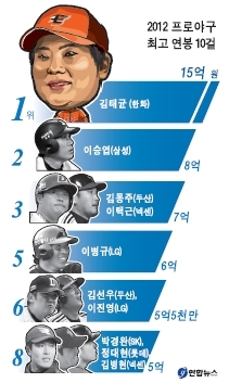 1루수인 김태균은 연봉 15억원에 사인해 8억원을 받는 이승엽(삼성)을 7억원 차로 따돌리고 역대 최고 연봉 선수가 됐다. 투수 중에서는 두산 김선우가 5억5천만원, 포수는 SK 박경완이 5억원으로 가장 많이 받는다.