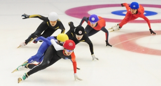 9일 전주 빙상경기장에서 열린 제93회 전국동계체육대회 사전경기 쇼트트랙 여중부 1500m 결승에서 선수들이 달리고 있다.