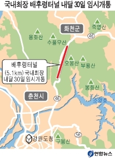 지난 10일 원주지방국토청에 따르면 최전방 양구군으로 가는 길목인 춘천 신북읍 유포리부터 화천 간동면까지 고갯길을 직선화한 배후령터널 공사가 대부분 마무리돼 시운전을 거쳐 내달 30일 임시개통할 예정이다.