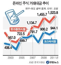 스마트폰 열풍 등에 힘입어 작년 온라인 주식 거래대금이 역대 최대를 기록한 것으로 나타났다.