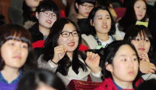 14일 전북대학교 삼성문화회관에서 열린 신입생 오리엔테이션에 학생들이 공연을 보며 환하게 웃고 있다.