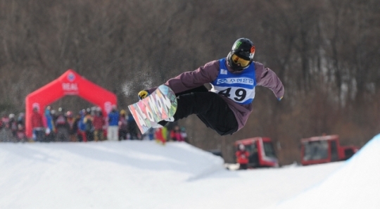 15일 무주 덕유산리조트에서 열린 제93회 전국동계체육대회 스노보드 하프 파이프 경기에 출전한 선수가 화려한 기술을 선보이고 있다.