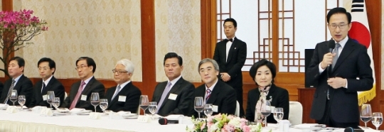 ▲ 이명박 대통령이 16일 청와대에서 열린 지역언론사 사장단 초청 오찬에서 인사말을 하고 있다. 왼쪽부터 제주일보 김대우, 전북일보 서창훈, 제민일보 진성범, 홍철 지역발전위원장, 경인일보 송광석, 부산일보 이명관, 대전일보 남상현, 이 대통령. 연합뉴스