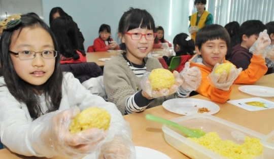 18일 전주자연생태박물관에서 열린 자연생태 에 학생들이 주먹밥을 만들고 있다.