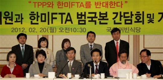 민주통합당 정동영 의원이 20일 국회 귀빈식당에서 열린 한일 의원 간담회를 마치고 나서 환태평양경제동반자협정(Trans-Pacific Partnership, TPP)와 한미FTA 반대하는 기자회견을 하고 있다. 연합뉴스