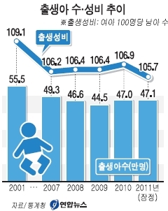 출생 여아 100명당 남아 수인 성비(性比)는 역대 최저 수준까지 떨어졌다.