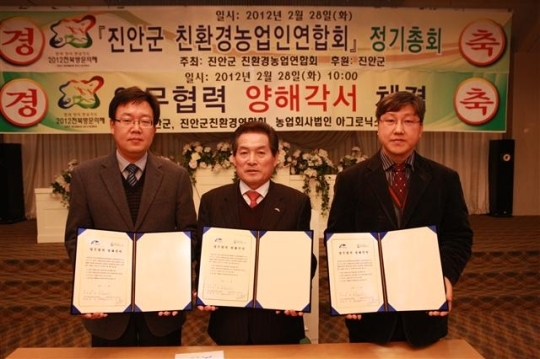 진안군과 진안군친환경농업인연합회, 농업회사법인 아그로닉스(주)가 군의 친환경농업을 위해 상호 공동협력하고 농업경쟁력 확보를 위해 28일 홍삼한방센터에서 업무협약(MOU)을 체결했다.
