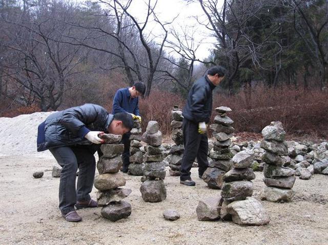 ▲ 진안군 관계자들이 돌탑 체험장에서 돌탑 쌓기 연습을 하고 있다.