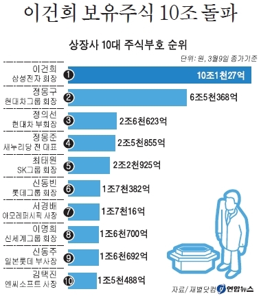 11일 재벌닷컴에 따르면 1820개 상장사의 대주주와 특수관계인이 보유한 주식가치를 평가한 결과 이건희 삼성전자 회장이 10조1027억원(9일 종가 기준)으로 가장 많았다.