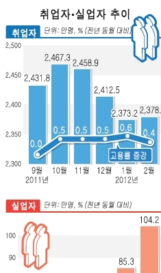 통계청이 14일 발표한 2월 고용동향에 따르면 지난달 취업자는 2378만3000명으로 작년 2월보다 44만7000명 늘었다.