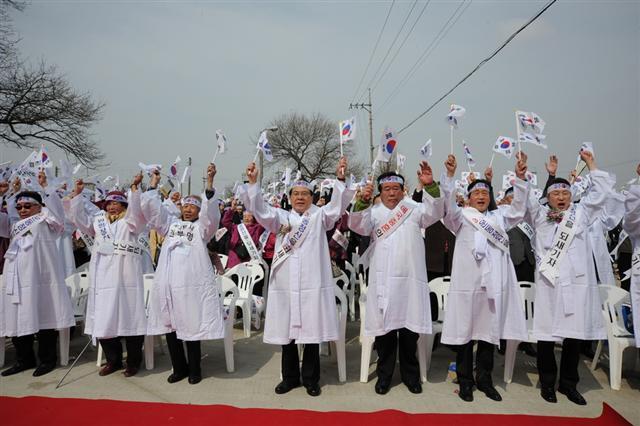 ▲ 원평장터 기미독립만세운동 기념행사에서 이건식 김제시장과 김현섭 도의원, 김복남·장덕상 시의원 등이 대한독립 만세를 외치고 있다.