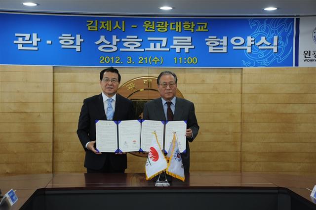 김제시와 원광대학교(총장 정세현)는 21일 원광대 회의실에서 상호교류 업무협약(MOU)을 체결하고, 상호 인적·물적 교류 협력을 통해 미래 동반자 관계로 발전해 나가자고 다짐했다.