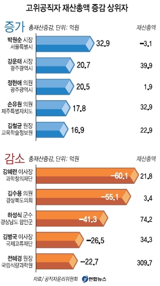 23일 정부공직자윤리위원회가 발표한 2012년도 고위공직자 정기 재산변동사항에따르면 박 시장은 -3억1056만원을 신고해 대상자 가운데 최저액을 기록했다.