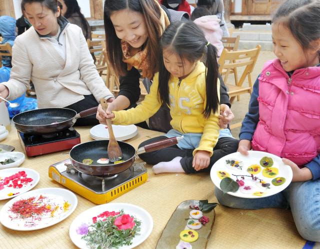 삼짇날 행사가 24일 전주 한옥생활체험관에서 열려 아이들이 삼짇날(음력 3.3) 즐겨 먹던 화전을 만들며 전통체험을 하고있다.