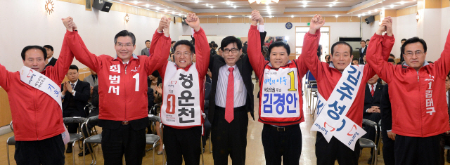 27일 새누리당 전북도당에서 열린 4.11 총선 승리를 위한 선거대책위 발대식에 태기표 위원장 및 각 후보들이 손을 들어 인사하며 필승을 다짐하고 있다.