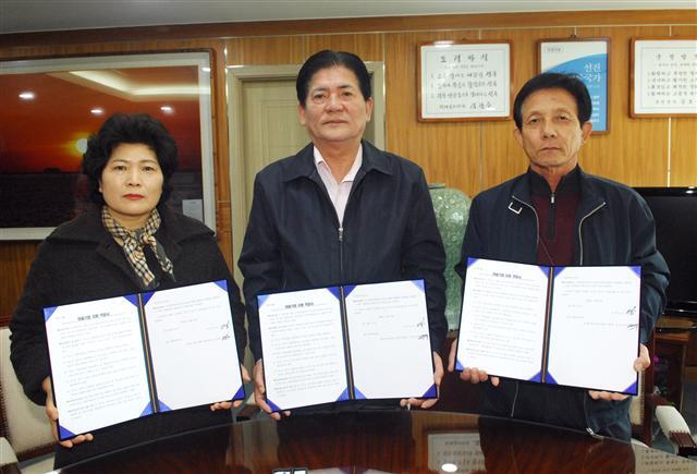부안군은 27일 마을기업육성사업의 일환으로 보안 용사마을 사랑감작목반, 하서 백련마을 연꽃장류작목반 등 2곳과 성공적인 기업육성을 위한 협약을 체결했다. 이날 김호수 부안군수는 마을기업 관계자들을 협약식을 맺고 성공적인 사업추진을 당부했다.