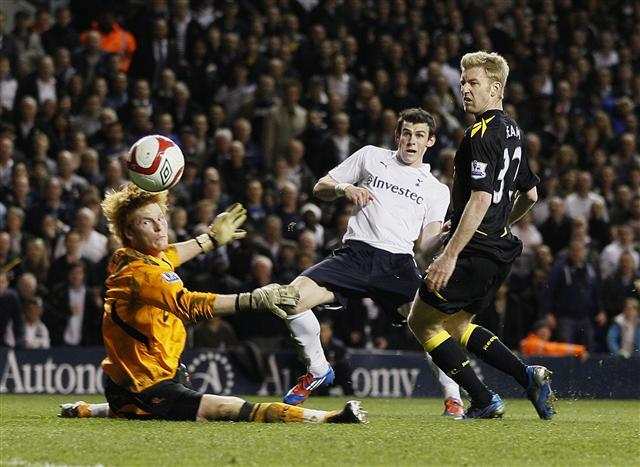 27일(현지시간) 런던 화이트 하트 레인 경기장의 잉글랜드 축구협회(FA)컵 준준결승 볼턴 원더러스와 재경기에서 토트넘 홋스퍼의 개러스 베일(가운데)이 상대 골키퍼 아담 보그던의 키를 넘기며 골을 성공시키고 있다. /AP=연합뉴스