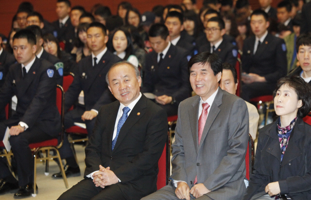 류우익 통일부장관(맨앞줄 왼쪽)이 28일 전주를 방문하여 전북대학교 진수당에서 '한반도 정세와 통일정책'이란 주제로 특강을 하였다.