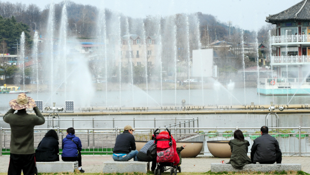 화창한 날씨를 보인 29일 전주 덕진공원 음악 분수대가 시험가동을 하자 시민들이 사진을 찍으며 즐거운 시간을 보내고 있다.
