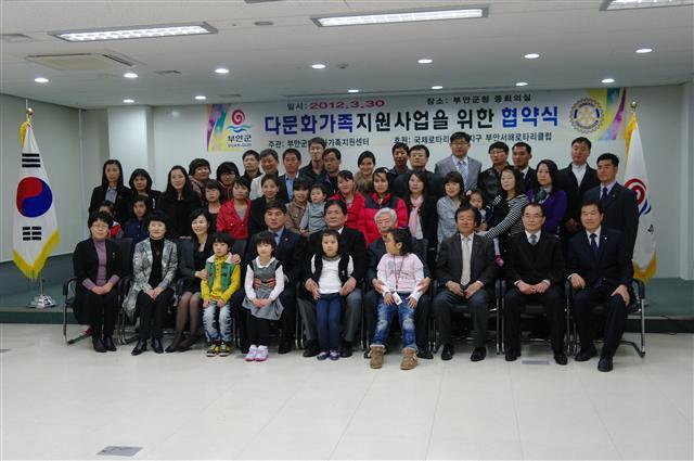 부안군과 국제로타리 3670지구 부안서해로타리클럽이 지난 30일 지역내 다문화가족 지원을 위한 MOU협약식을 갖고 김호수 군수를 비롯한 군청 관계자들과 부안서해로타리클럽 김재희 회장 및 회원들이 기념촬영을 하고 있다. 이날 협약식에서는 다문화가족 바이올린협주단인 '칸타빌레'창단을 지원하기 위한 실무논의에 나섰다. 이에 따라 부안서해로타리클럽은 앞으로 칸타빌레측에 바이올린 10개와 교재, 1년 동안의 교육비를 지원하고 지속적인 지원을 약속했다.