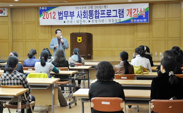 이에따라 지난 26일 정읍농협 대회의실에서 유남영조합장과 임직원, 여성결혼 이민자와 가족등 40여명이 참석한 가운데 '2012 법무부 사회통합프로그램 개강식'을 갖고 교육을 시작했다. 이날 개강한 상반기 교육과정에는 필리핀, 베트남,캄보디아 결혼이민자들을 대상으로 매주 월,수,목요일 각각 4시간씩 6월30일까지 진행된다.