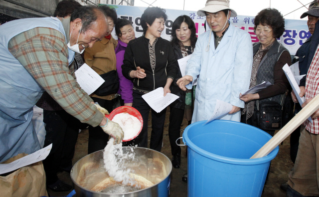 전주시농업기술센터주최로 지난달 31일 전주 호성동 하오마을에서 열린 자연농업 현장교육에 미나리 시설채소농가 농민들이 자연농법인 황토유황 및 천연유화제 제조법등 자연농약 사용법에 대한 설명을 듣고 있다.
