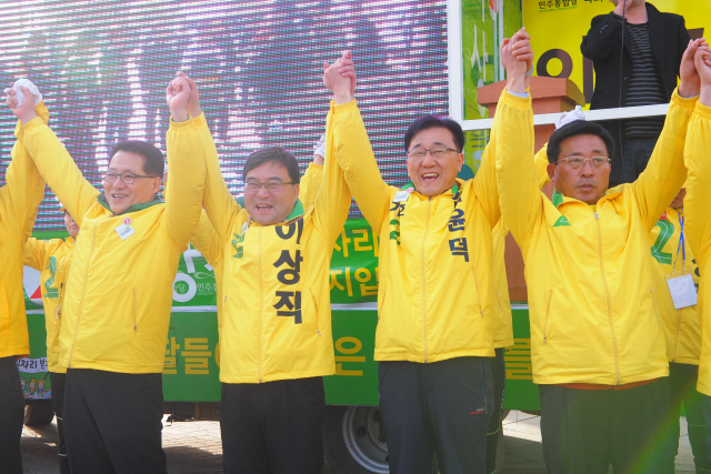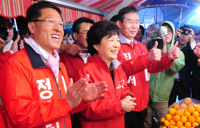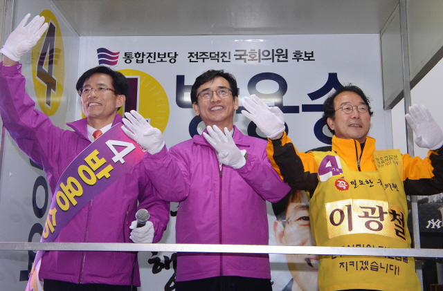 4·11총선 공식 선거운동이 시작된 첫 주말을 맞아 여야 중앙당의 도내 선거지원 유세가 펼쳐진 가운데 박근혜 새누리당 선거대책위원장과 박지원 민주통합당 최고위원, 유시민 통합진보당 공동대표(사진 위쪽부터) 등이 각 당 후보들과 함께 합동유세를 펼치고 있다.