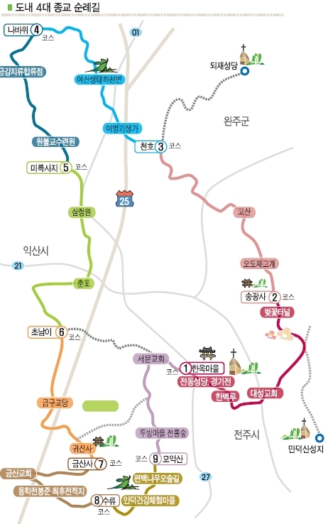 도내에는 천주교·불교·기독교·원불교 등 4대 종교의 명소가 분포돼 있다. 전주·익산·김제·완주에 걸친 '아름다운 순례 길'은 4대 종교의 성지를 엮은 길이다. 네 종교의 다양한 역사와 풍경을 콘텐츠화해 종교인과 비종교인 모두에게 도보·자전거 길로 제공하기 위해서다.