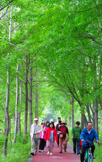 ▲ 아름다운 순례길 중 치명자산 숲 길을 걷는 사람들.