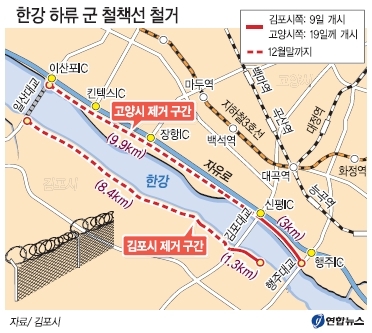 8일 시에 따르면 관할 군부대가 9일 오전 서울외곽순환고속도로 김포대교 지점에서 상류방면으로 김포측 1.3㎞ 구간의 철책 제거 작업을 시작한다. 군부대는 2∼3일 내 이 구간 철거를 마무리할 방침이다.